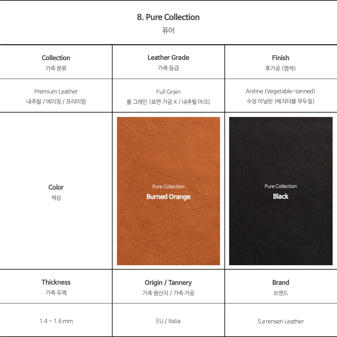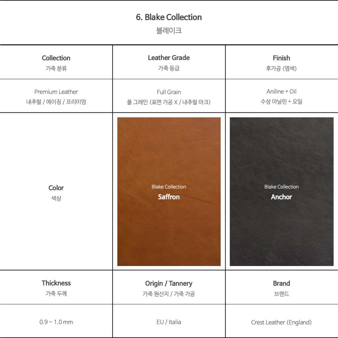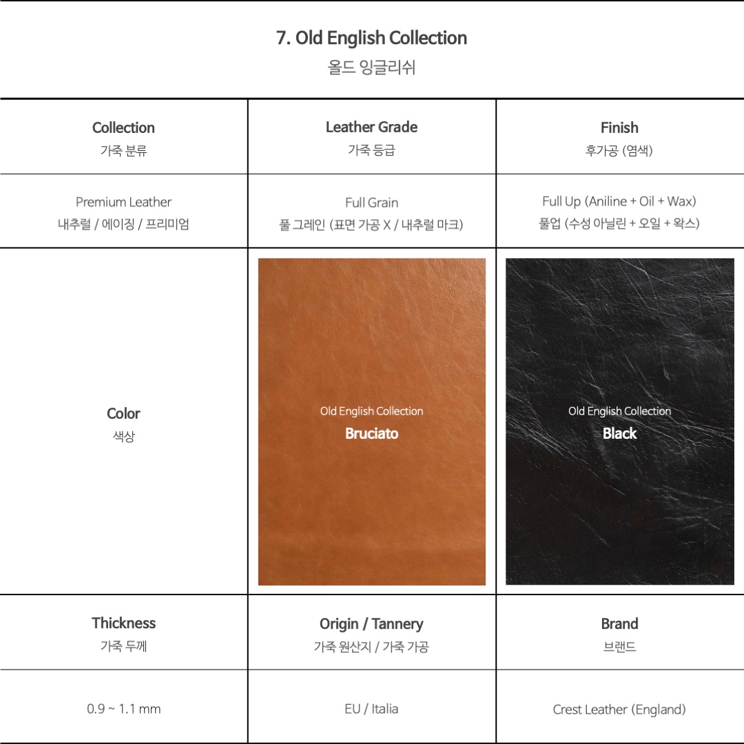 - Premium Collection에는 표면을 아닐린 수성 염색 후 오일 [ 6. Blake 블레이크 ]와 오일과 왁스로 광택과 빈티지 무드를 더한 [ 7. Old English 올드 잉글리쉬 ] 그리고 순수한 아닐린만으로 마감하여 가죽의 본질적인 매력을 경험할 수 있는 [ 8. Pure 퓨어 ]로 구성되어 있습니다.