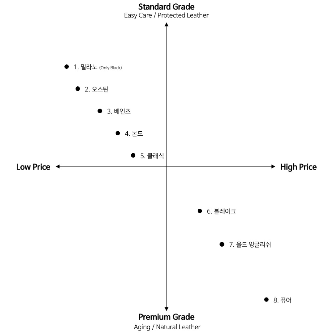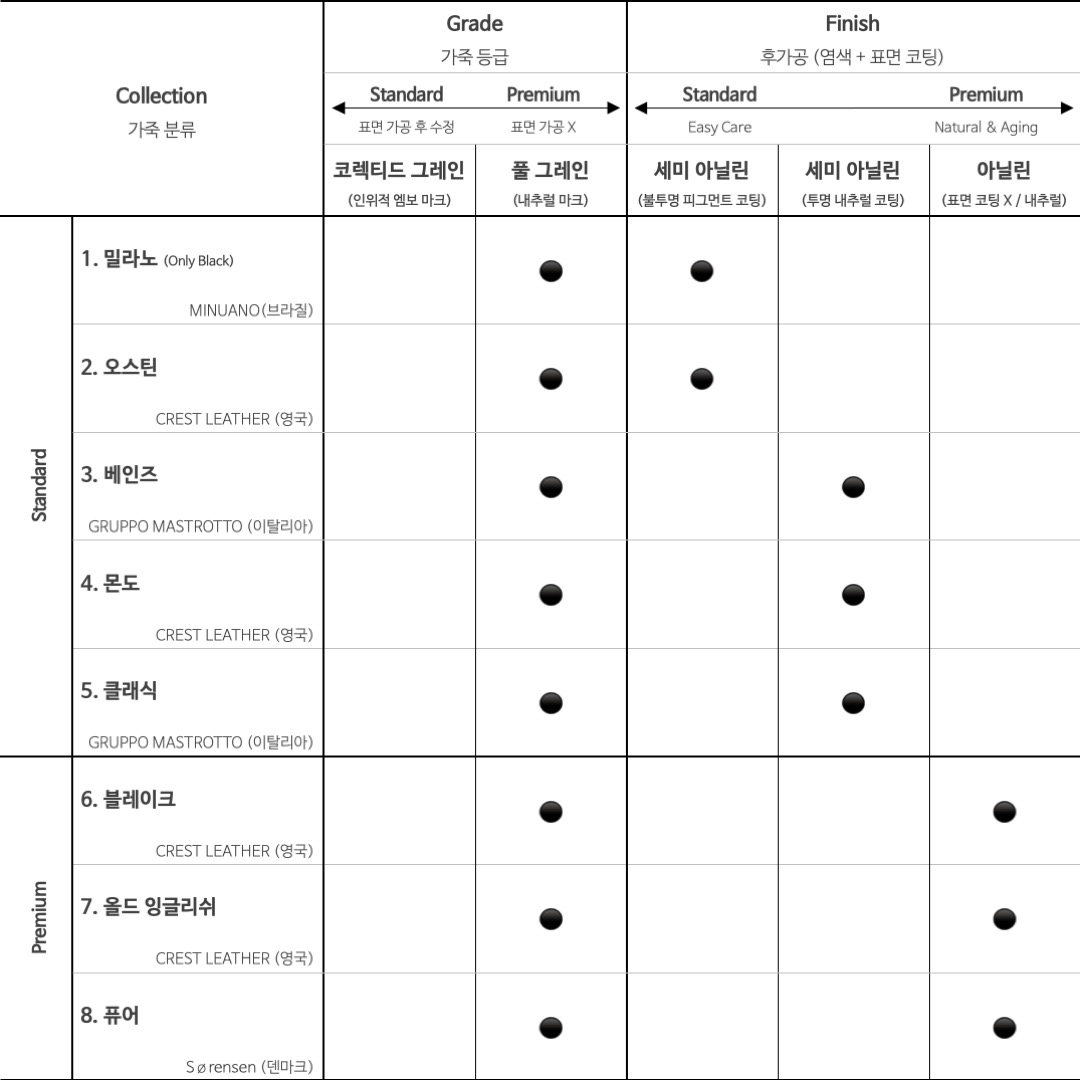 가죽 컬렉션 포지셔닝에 따른 특징을 확인하고 자신에게 알맞은 가죽을 선택해 보세요.