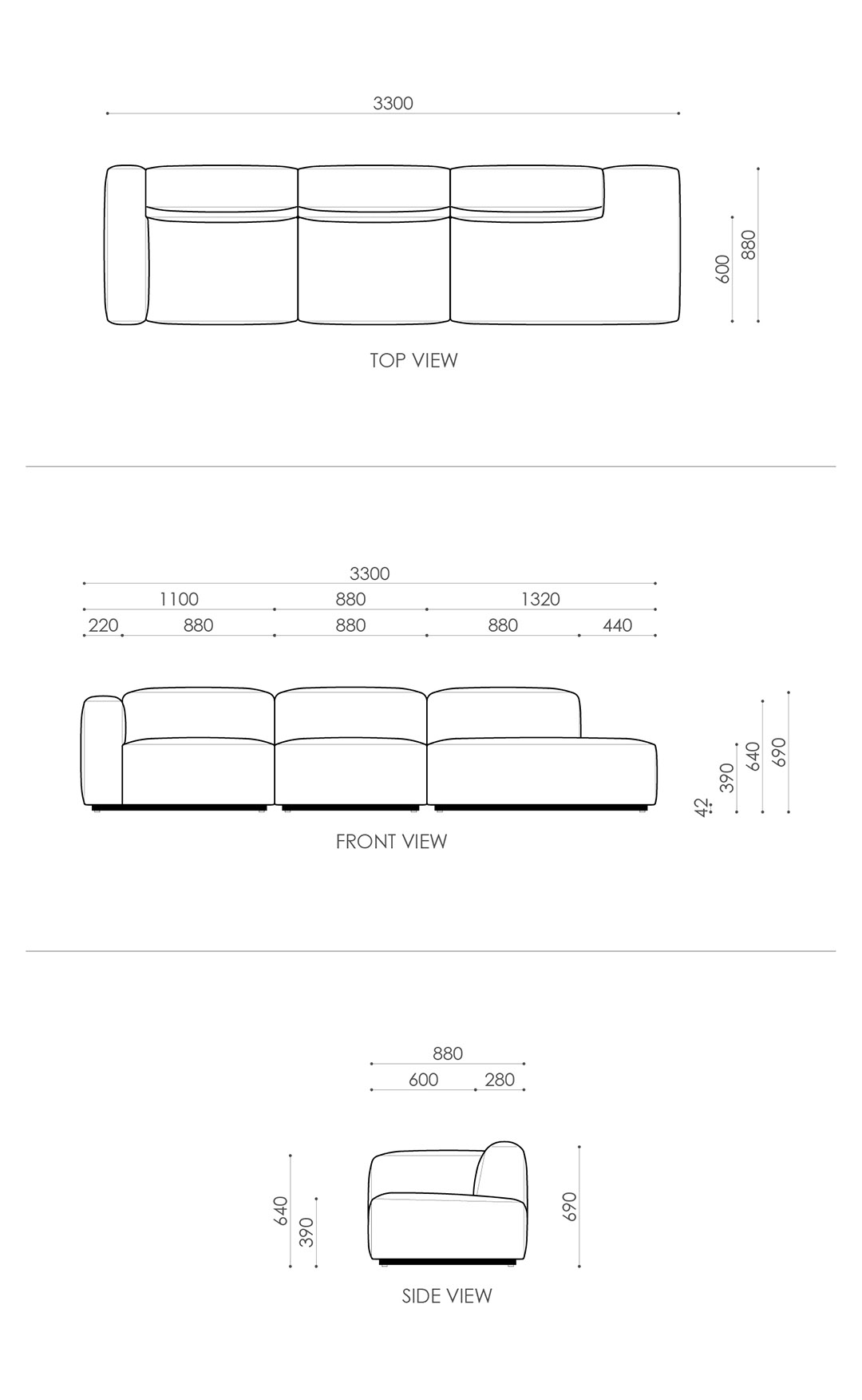 - 3300 (가로) X 690 (높이) X 880 (깊이) mm
